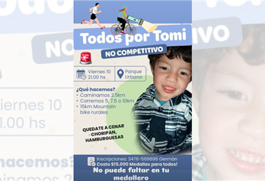 La inscripción tiene un costo de $15.000 por persona, y quienes participen podrán disfrutar además de un espacio gastronómico con hamburguesas y choripanes. Toda la recaudación será destinada a cubrir el tratamiento de Tomi.