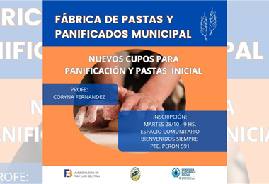 La Municipalidad de Fray Luis Beltrán, a través de la Secretaría de Desarrollo Social, informó la apertura de nuevos cupos para el curso de Panificación y Pastas – nivel inicial, una capacitación que se desarrolla en el marco del programa Fábrica de Pastas y Panificados Municipal.