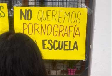 “Somos los padres quienes eligen la educación para nuestros hijos, NO el Estado”; “El Código Penal castiga con prisión la corrupción de menores”; y “No queremos pornografía en la escuela”, fueron los carteles que pegaron los padres en la escuela.